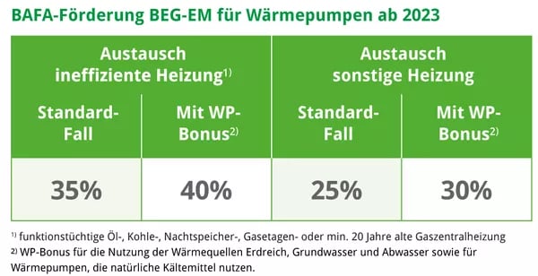 - Ab 1.1.2023 gibt es einen Bonus von fünf Prozent für Wärmepumpen mit natürlichem Kältemittel. Somit hebt sich der Standard-Fördersatz für Wärmepumpen von 25 Prozent in beiden Konstellationen auf 30 Prozent.