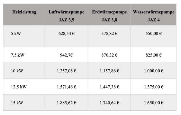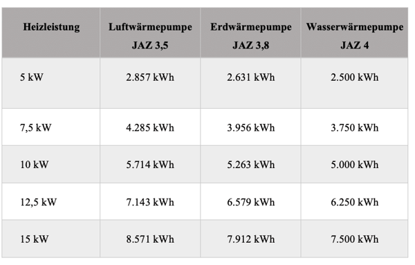 Tabelle 1: Berechnung des Stromverbrauchs pro Jahr nach Heizleistung und Wärmepumpenart.