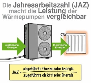 Die Jahresarbeitszahl (JAZ) ist eine wichtige Kennziffer für die Effizienz einer Wärmepumpe. Sie beschreibt das Verhältnis zwischen von der Wärmepumpe ans Heiznetz abgegebenen Energie und in diesem Zeitraum aufgenommenen elektrischen Energie. Einfacher gesagt: das Verhältnis zwischen der erzeugten Wärmeenergie und dem verbrauchten Strom. Die Wärmepumpe arbeitet umso effizienter, je höher die JAZ ausfällt.